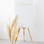Tabla za sedežni red iz pleksi stekla z čudovitim zlatim ogledalnim napisom na beli podlagi.